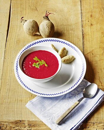 1. Řepu, mrkev a fenykl oloupejte a nakrájejte na malé kostičky. Orestujte na rozpuštěném másle, poté zalejte vývarem, ochuťte solí, kmínem, galgánem (0,5 lžičky) a vařte do měkka. Rozmixujte, přidejte smetanu a ještě krátce povařte.