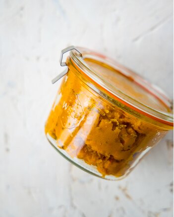 Auf dem Foto ist ein Glas mit cremigen Ofenkürbispürree zu sehen. | © SONNENTOR
