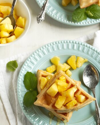 Jablka umyjte, oloupejte a nakrájejte na malé kostičky. Z těsta pečte vafle a podávejte s jablky a kopečkem jogurtu.