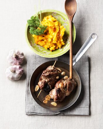 Maso nakrájejte na 8 plátků (steaků) a rozklepejte zhruba do tvaru obdelníku. Steaky potřete z obou stran Kořením na pečení tetičky Aničky, naplňte je nadrobno nakrájenými sušenými švestkami, srolujte a převažte kuchyňským provázkem nebo propíchněte špejlí na šašlik.