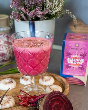 Připravte si 1/2 l čaje Bláznivě milovat. Dva sáčky této směsi zalijte vroucí vodou a nechte alespoň 10 minut luhovat.