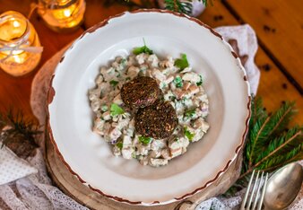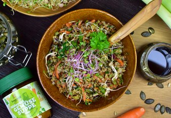 Přidejte 2 lžíce koření na jídla z jednoho hrnce, špetku Ayurvédské kouzelné soli a 2 lžíce olivového oleje.