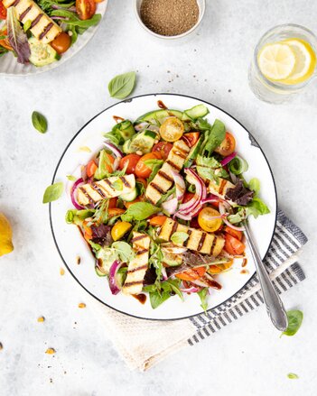 Na salát položte halloumi, posypte jej lístky čerstvé bazalky a dozdobte balzamikovým krémem. Nakonec posypejte opraženými piniovými oříšky a můžete podávat!