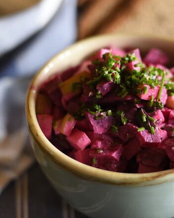 Uvařenou řepu oloupejte a nakrájejte na kostičky. Na stejně velké kousky nakrájejte i jablko. Do tohoto salátu se výborně hodí zralé, ale kyselkavé jablíčko.