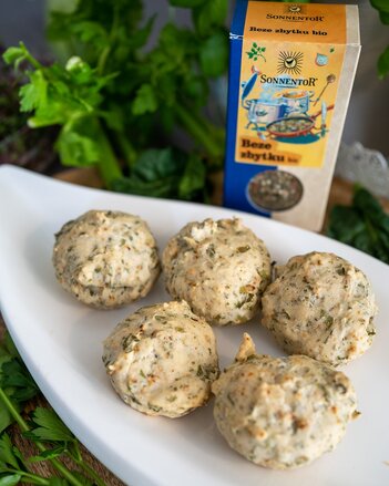 Smíchejte mouku s práškem do pečiva a a přidejte lžíci koření Beze zbytku. Vše důkladně promíchejte. Postupně přimíchejte rostlinné mléko a olivový olej. Nakonec přidejte velkou hrst nasekané petrželové natě a znovu důkladně promíchejte.