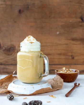 Do horkého mandlového mléka přidejte dýňové pyré a všechno koření. Ručním mixérem ještě za tepla vymixujte do nadýchané pěny a rozdělte do sklenic.