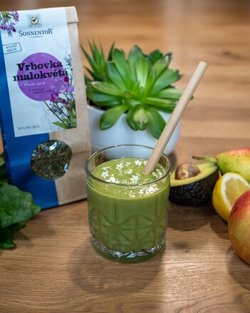Čajovou lžičku vrbovky vyluhujte ve 250 ml horké vody a nechte vychladnout. Přidejte ostatní ingredience a umixujte do hladka.