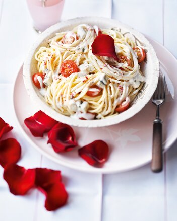 Špagety dejte uvařit. V malém kastrolku rozpusťte sýr se smetanou. Přidejte 2 lžičky Všechno nejmilejší – směs květů a koření. Polovinu rajčat nakrájejte na poloviny, přidejte ke špagetám a jemně promíchejte vidličkou. Podávejte ozdobené zbývajícími rajčaty, směsí květů a koření Všechno nejmilejší a čerstvými okvětními plátky růže.