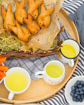 Nakynuté těsto ještě jednou dobře propracujte, vyválejte z něj válec a ten rozdělte na 9 částí. Z každé části vyválejte zhruba 20 cm dlouhý váleček, přehněte jej napůl a z konců vytvarujte zaječí ouška.