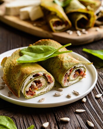 Palačinky pečte na pánvi nasucho z obou stran. Na náplň nadrobno nakrájejte sušená rajčátka i jarní cibulku a smíchejte se sýrem a jogurtem.
