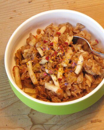 Podle chuti nastrouhejte ovoce, např. jablka a zamíchejte k müsli.