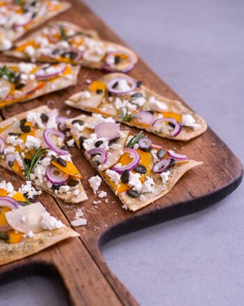 Nakonec dýňový tarte flambée obložte rozdrobenou (třeba veganskou) fetou, rozmarýnem a dýňovými semínky.