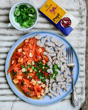 Tofu s mrkví na růžovém pepři s pohankovými nočky