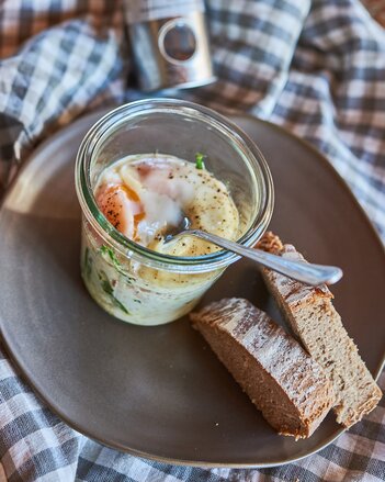 Nadrobno nakrájené přísady (cibulka, zelenina, případně na kostičky nakrájená šunka nebo slanina…) vložte do tukem (máslem nebo olejem) vymazané sklenice. Navrch přidejte dvě vejce a sklenici uzavřete (nezapomeňte sundat gumové těsnění).