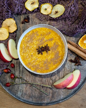 Do fermentovaných vloček zamícháme dýňové pyré ochucené Jablečným kouzelným punčem a dáme do misky.