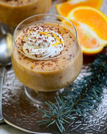 Do mixéru vložte uvařenou a zcezenou dýni, zalijte ji uvařeným mlékem, přidejte kakaové boby, šťávu z jednoho pomeranče, lžíci perníkového koření, sirup a vše rozmixujte dohladka.