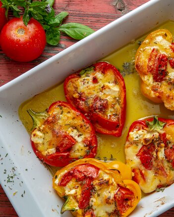 Rozpůlíme a vydlabeme papriky. V misce smícháme na kousky nakrájená rajčata, fetu, mozzarelu, koření, popřípadě dosolíme. Směsí naplníme papriky, polijeme olejem (nešetříme!) a dáme zapéct do trouby na horký vzduch.