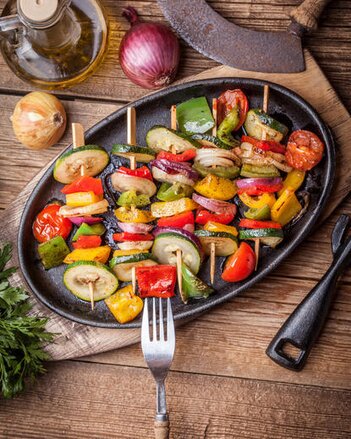 Všechnu zeleninu omyjte a nakrájejte na zhruba stejně velké kousky. Napichujte střídavě na špízové jehly.