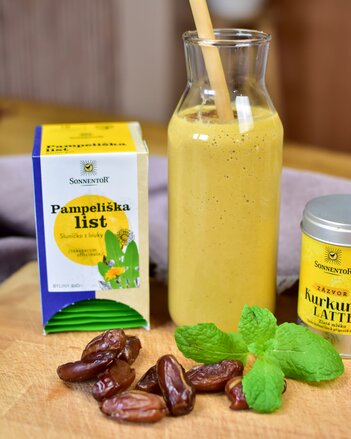 Do mixéru dejte lžíci arašídového másla, 4 namočené mandle, půl manga, půl lžičky Kurkuma Latte zázvor, půl lžičky mletého zázvoru a zchladlý pampeliškový čaj. Vše rozmixujte.