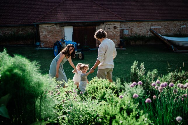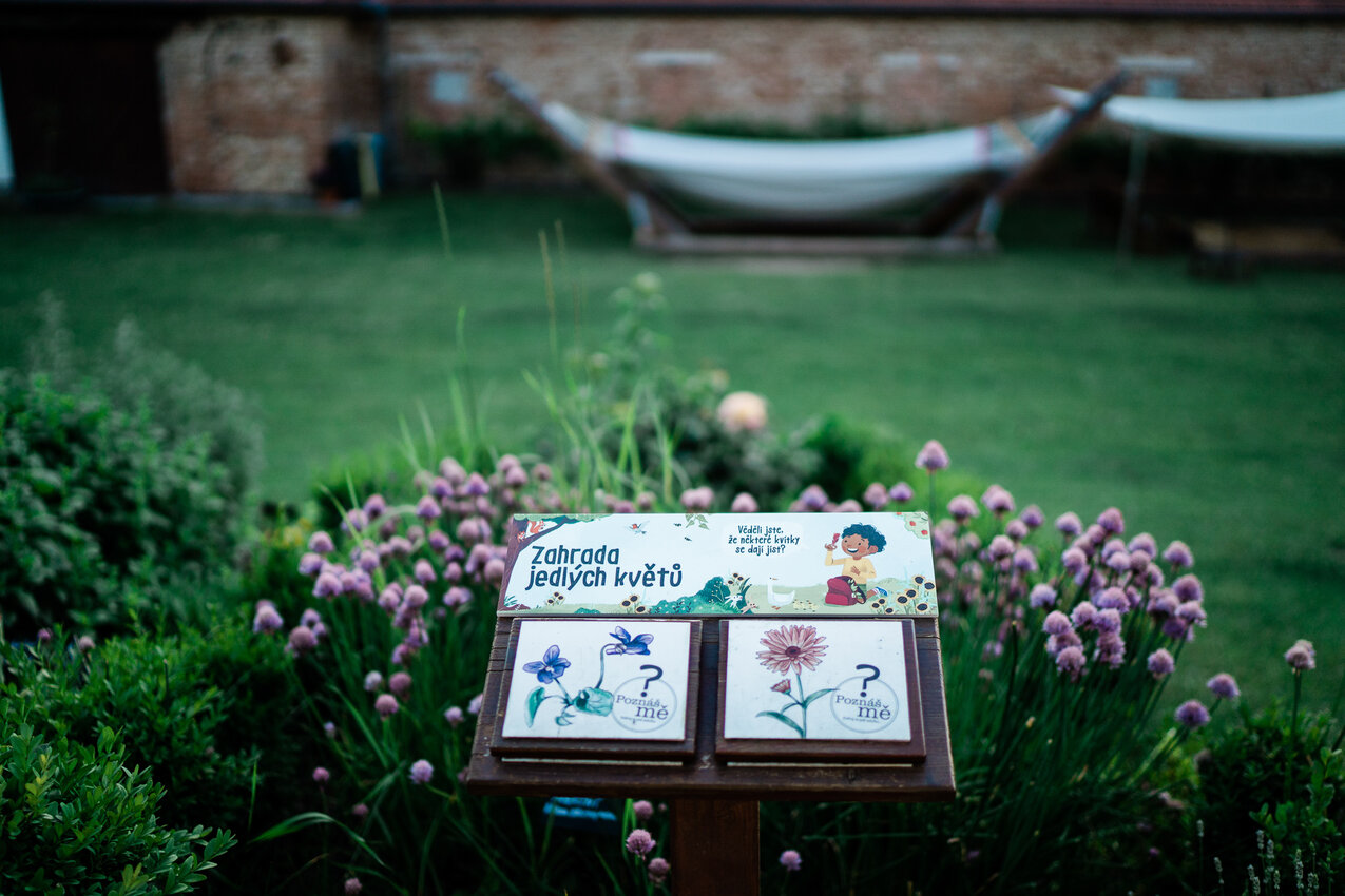 Zde naleznete širokou škálu bylin a okrasných rostlin, které zpříjemní nejen vaši procházku zahradou, ale i posezení na bezbariérové terase se zastíněním či na lavičkách. Součástí je i samoobslužný zdroj pitné vody v provedení čajových konviček. Napít se z takového pítka nebudou chtít jenom děti. A co teprve obří houpačka?