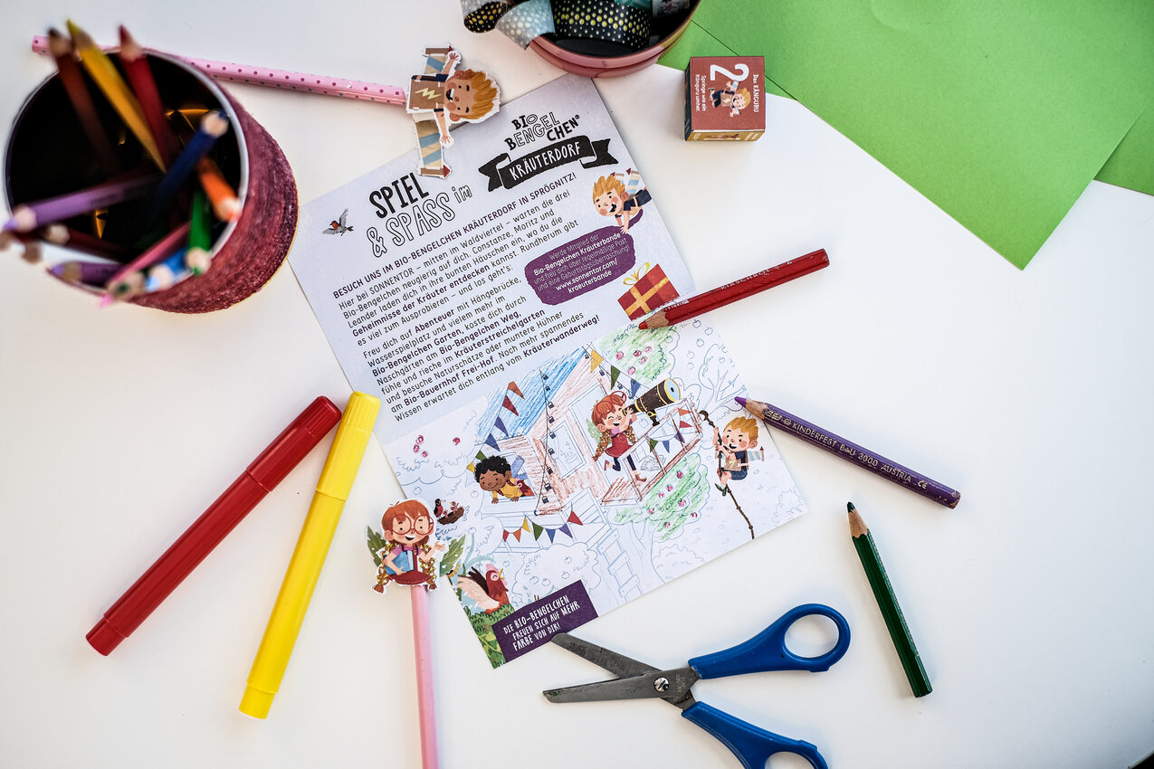 Constanze, Moritz und Leander heißen dich als Mitglied in der Bio-Bengelchen Kräuterbande Willkommen und schicken dir zwei- bis dreimal im Jahr Post mit lustigen Überraschungen wie einem Gutschein für ein Geburtstagsgeschenk. Den Gutschein kannst du in den SONNENTOR Geschäften einlösen, außerdem laden dich die drei Bio-Bengelchen zu einer gratis Betriebsführung durch die duftenden Kräuterhallen ein.