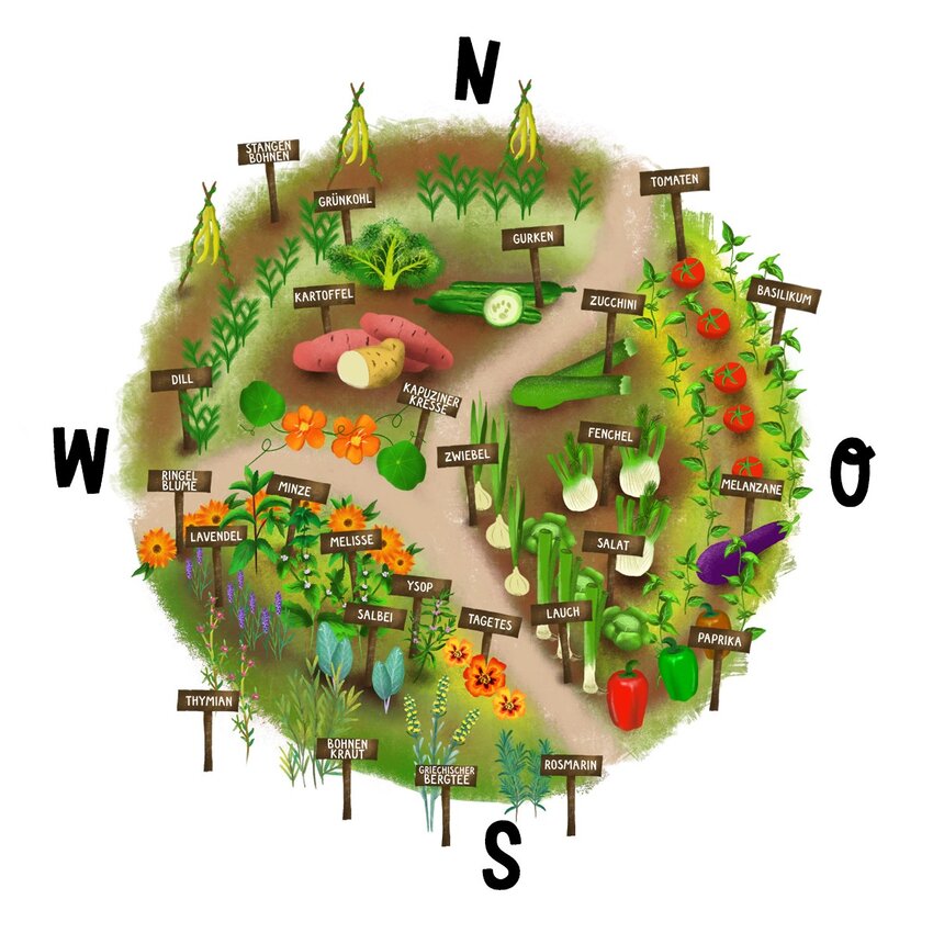 - Die Nährstoffansprüche der benachbarten Pflanzen sollten übereinstimmen. Im Plan sind südseitig Kräuter zu finden, die wenig Nährstoffe brauchen. Pflanzen wie Lauch, Salat und Zwiebel haben einen mittleren Nährstoffanspruch. Tomaten, Zucchini, Fenchel, aber auch Gurken und Grünkohl benötigen viele Nährstoffe.
