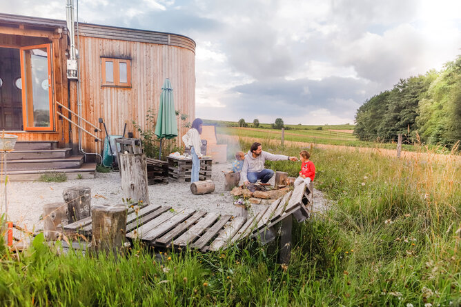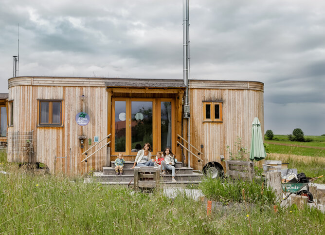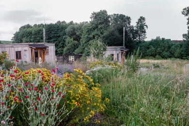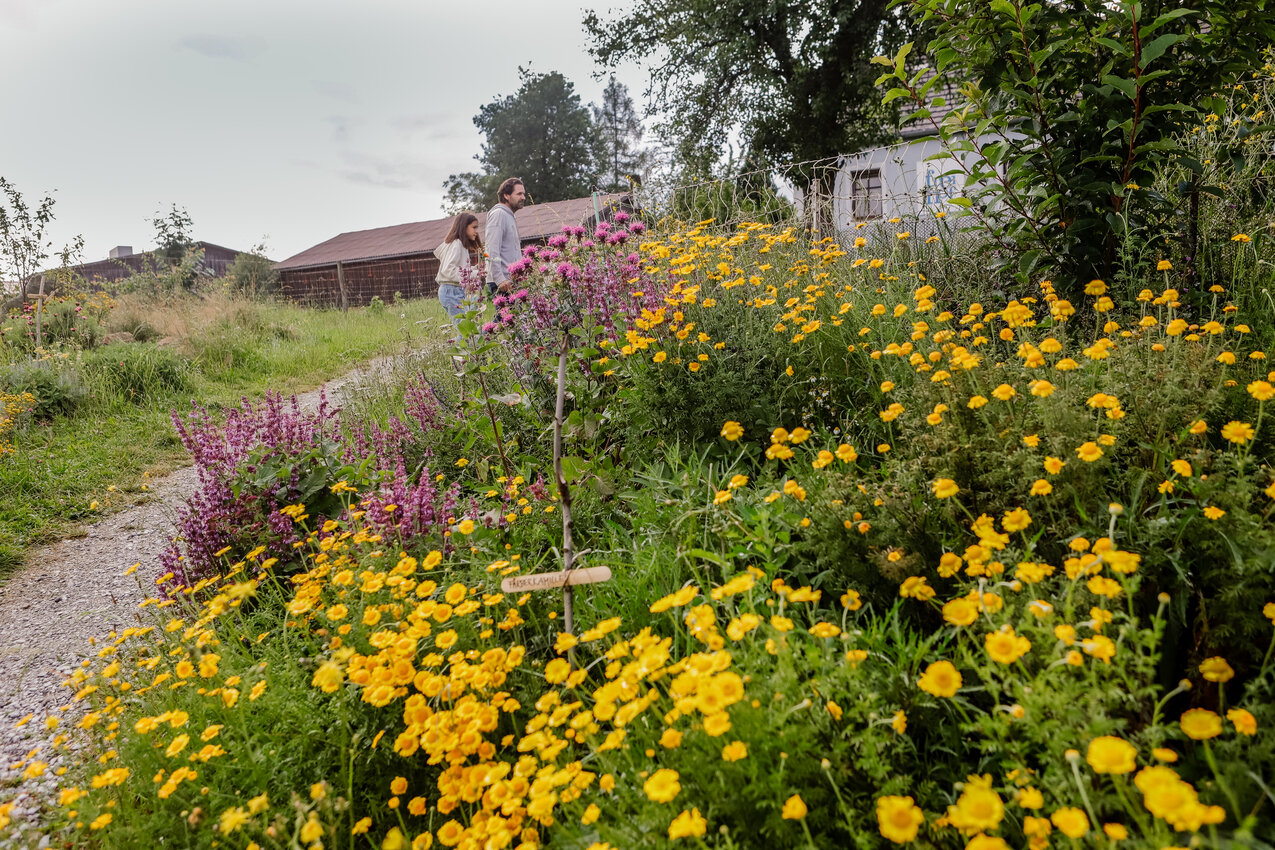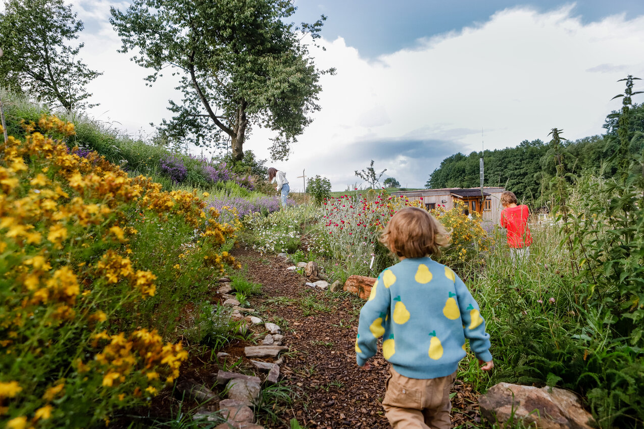 Sonnengelbes Johanniskraut und zitronengelbe Nachtkerzen leuchten im Gegenlicht der Sommersonne. Tiefblaue Regenwolken hängen majestätisch am Horizont über dem Land-Loft Anna Apfelminze und den dahinterliegenden Feldern. Eine einzigartige Kulisse, erfüllt vom Duft der Kräuter und der Farbintensivität der Wildpflanzen. Und...übermutigem Kinderlachen. Vorfreude liegt in der Luft, das kann man spüren und hören!