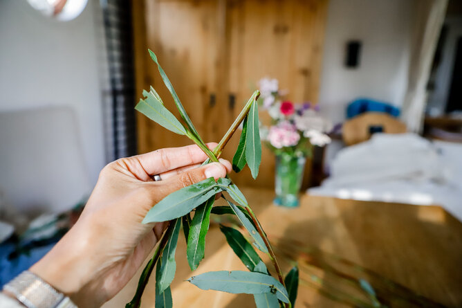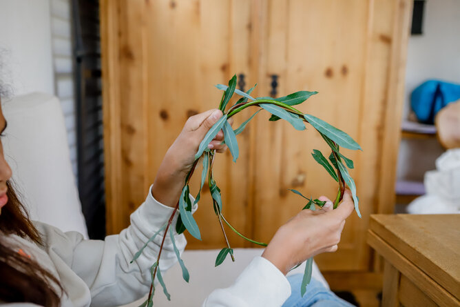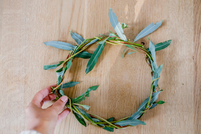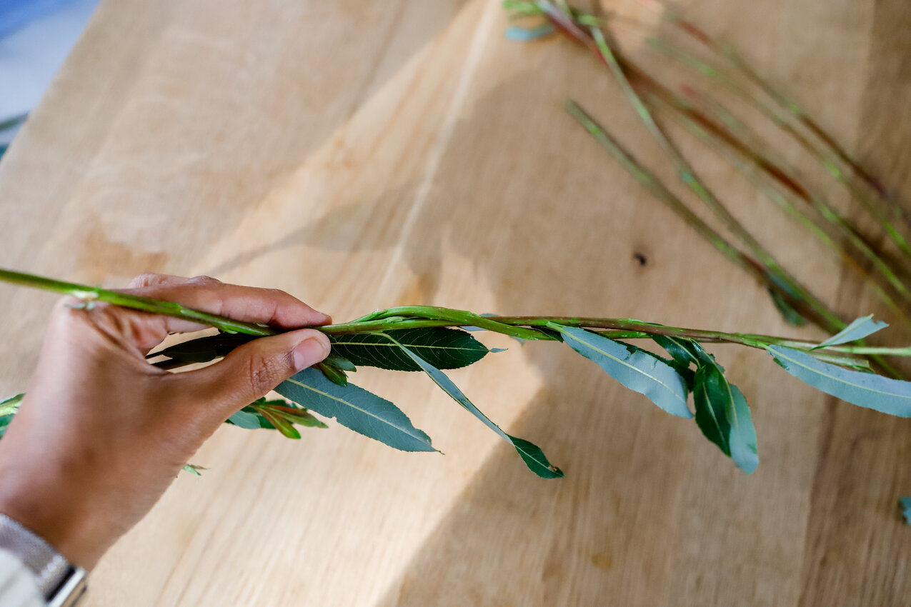 Der Stengel der Blüten sollte etwa. 10 cm lang sein. Den ersten Zweig (Basiszweig) zu einem Ring biegen und am Kopf abmessen, ob der Umfang passt. Die Enden sollten sich überkreuzen. Die Blätter der Zweige werden bis auf die des Basiszweiges entfernt. Die Enden werden überkreuzt und mit Daumen und Zeigefinger festgehalten.