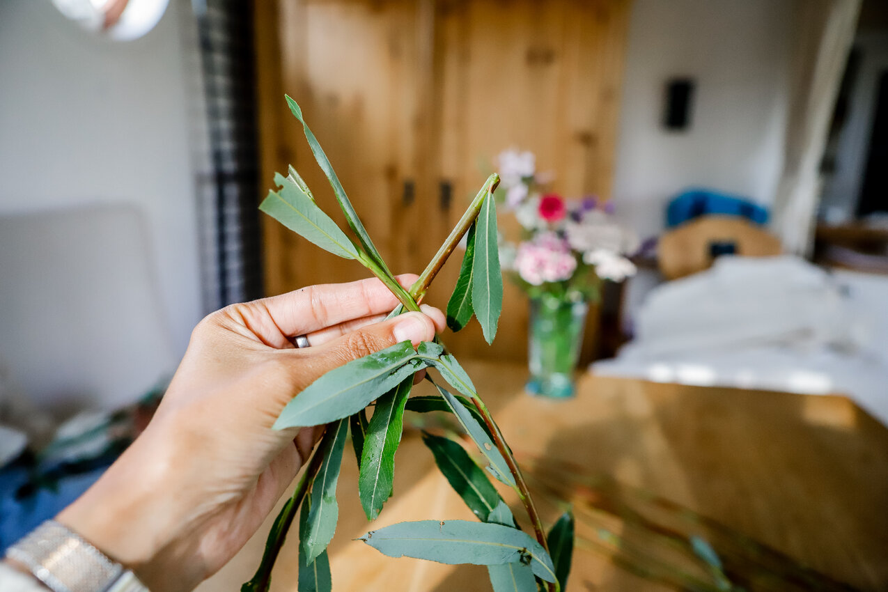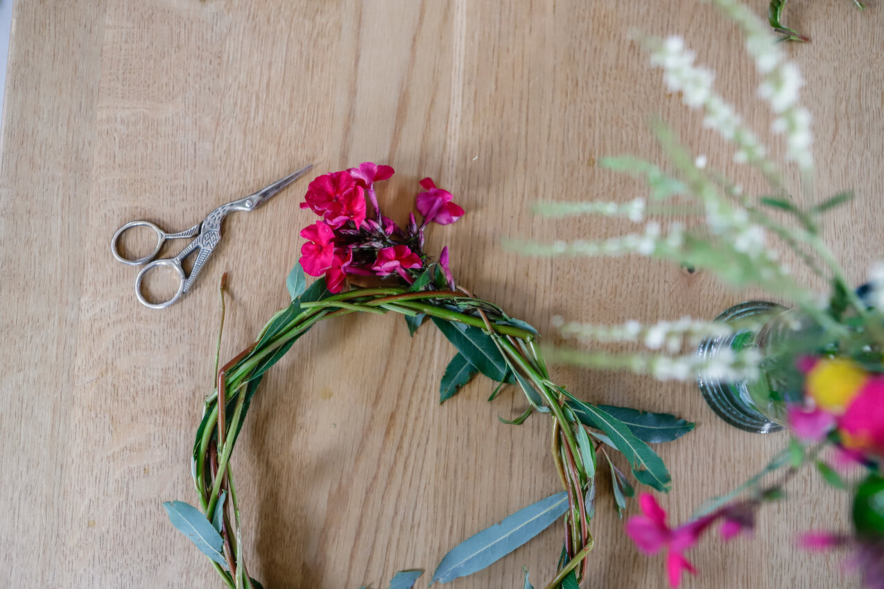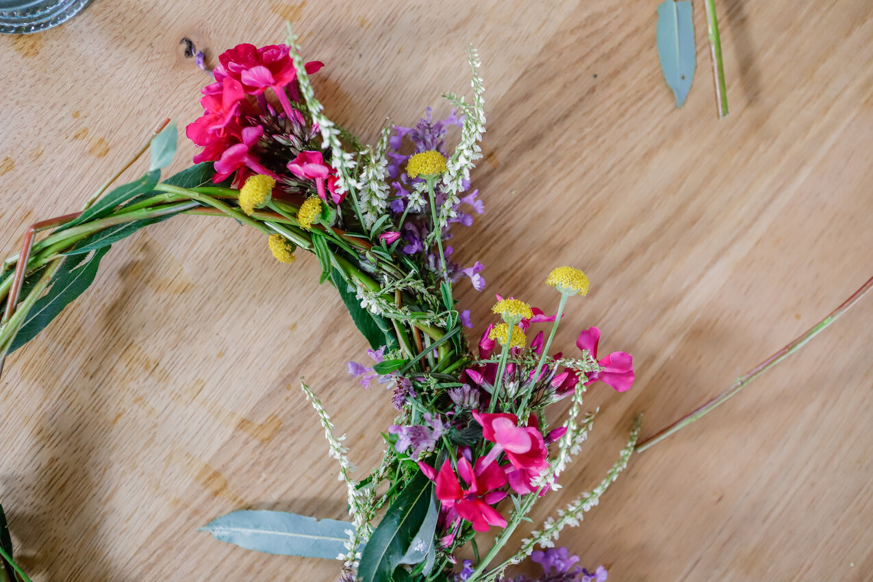 Sollten noch Stengel und Blüten überstehen, kann auch ein etwas festerer Grashalm als Fixierung dienen, der wie die Zweige um die Blumen gewickelt wird. Fertig!