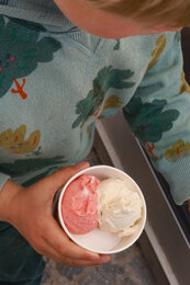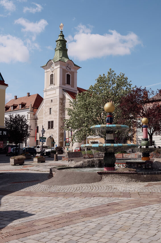 Nun sind wir gut gestärkt für einen Spaziergang durch Zwettl und erfreuen uns an den hübschen bunten Fassaden, dem emsigen Treiben an diesem Samstag-Nachmittag und vor allem an dem köstlichen Bio-Eis aus dem Bio-Genusskaffeehaus Hölzl. Wir probieren uns durch Mohn-, Joghurt-Kirsch-, Apfelstrudel- und Holunderblüten-Eis und genießen es in der Sonne am Hunderwasserbrunnen.