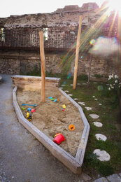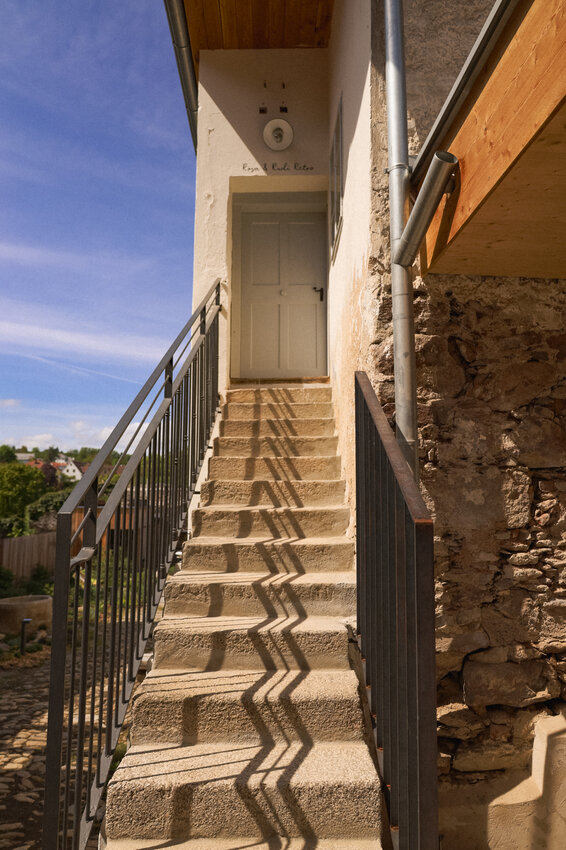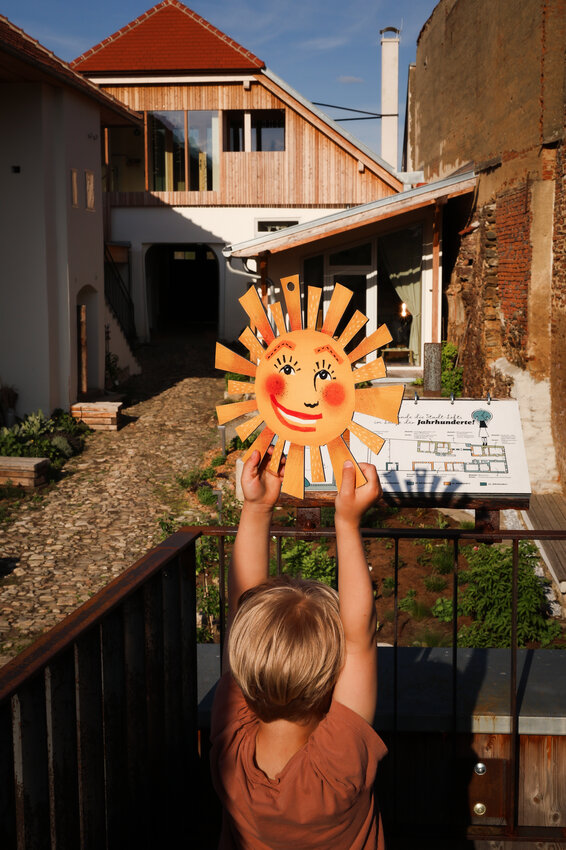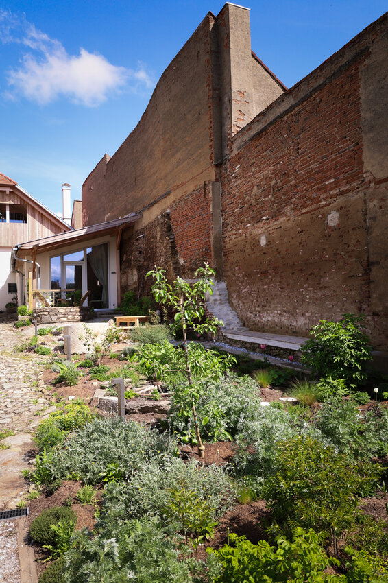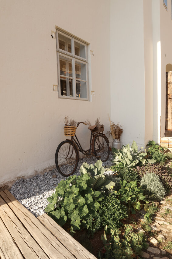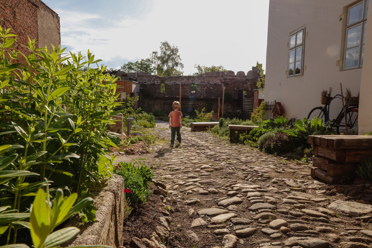 Langsam wird das Licht sanfter und wir genießen die frühen Abendstunden im wunderschönen Innenhof der Stadt Lofts. Im Schutz der dicken Stadtmauer ist es besonders gemütlich und man entdeckt an jeder Ecke neue Besonderheiten nach dem Gedanken „Altes mit Neuem“, Zäune werden zu Rankhilfen, Wagenräder zu Beeten, Trampelpfade mit Blättermotiven führen durch die liebevoll angelegten Kräuter- und Staudenbeete. Überall sind Hinweise und Schilder versteckt, die die Geschichte dieses Ortes zugänglich machen. Die alten Möbel, die hier verwendet wurden, Fundstücke, Hörstationen und Rätsel machen die Geschichte außerdem spürbar. Gleich beim Eingangsbereich gibt es außerdem noch eine Gemeinschaftsküche und einen Willkommensraum, das Dachgeschoss ist ein großer Seminarraum, der für Workshops und Veranstaltungen gebucht werden kann.