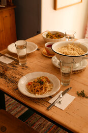 Abends wird die Küche nochmals angeheizt und wir bereiten einen bunten Salat und eine schnelle Pasta mit vielen verschiedenen Kräutern aus dem Garten im Innenhof zu. Müde fallen wir ins Bett und bewundern im letzten Licht des Tages die schönen Stuck-Elemente an der Decke, sowie die geschichtsträchtige bunte Patina an manchen Teilen der Wände.