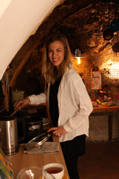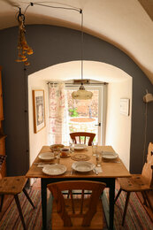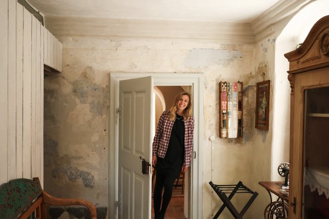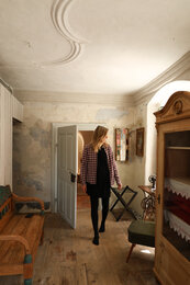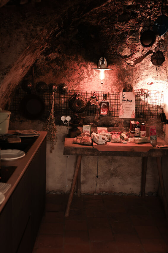 Per Email haben wir den Zugangscode für unser Appartement, genannt „Sieglinde Schwarz“, bekommen. Schon beim Eintreten sind wir Feuer und Flamme für das Interieur - es wurde mit so viel Liebe zum Detail restauriert und eingerichtet, dass man sich umgehend wie zuhause fühlt. Wir verlieben uns sofort in die alten Weichholzmöbel, die Trockenblumen, die von der Decke hängen, die Vintage-Lampen und vor allem in die Rauchkuchl. Hier wurde früher auf offenem Feuer gekocht und die Wände wurden erhalten und restauriert, um Erinnerungen und Träumereien an vergangene Zeiten zu beflügeln.