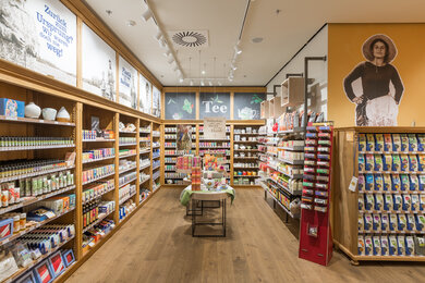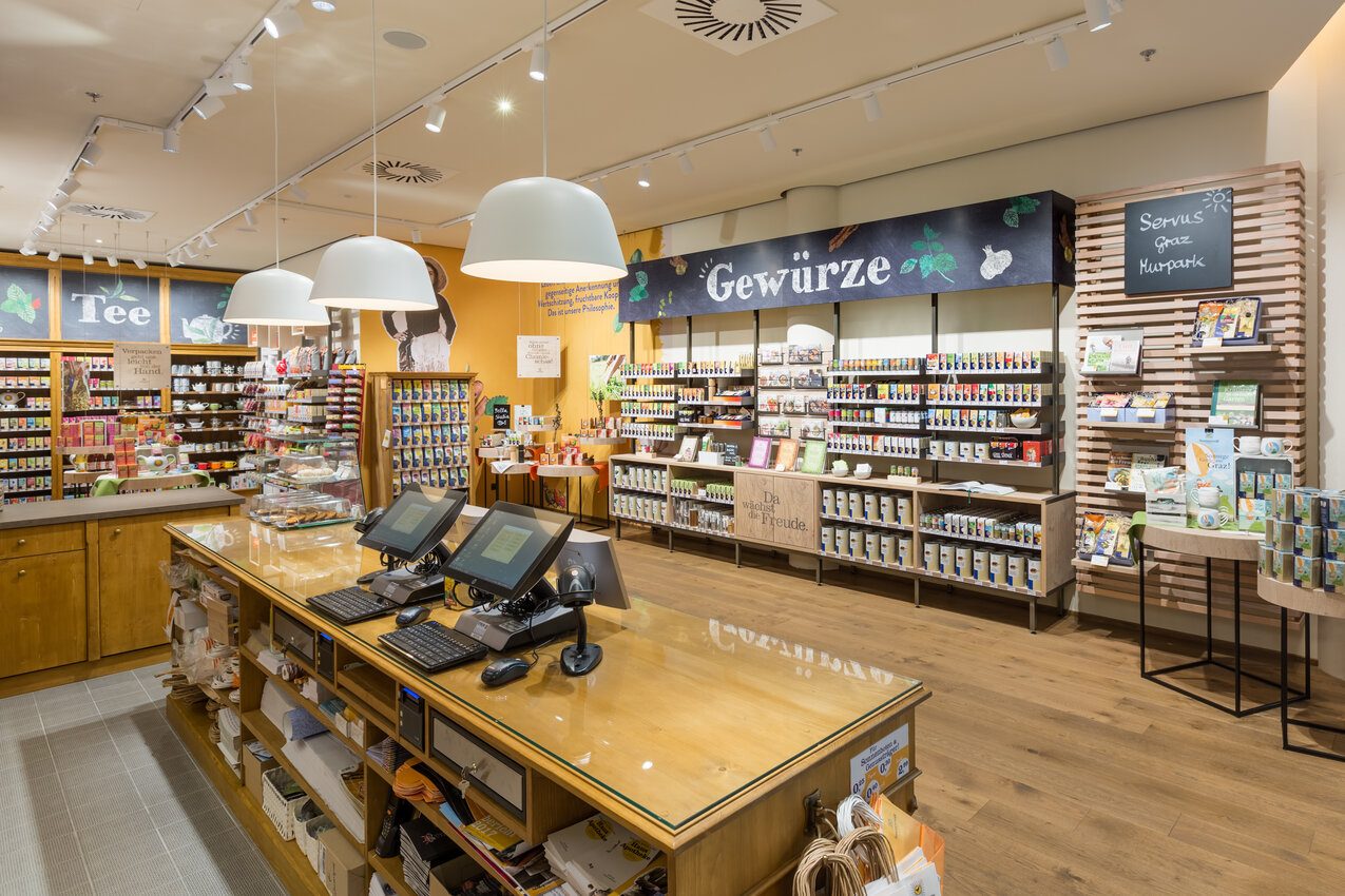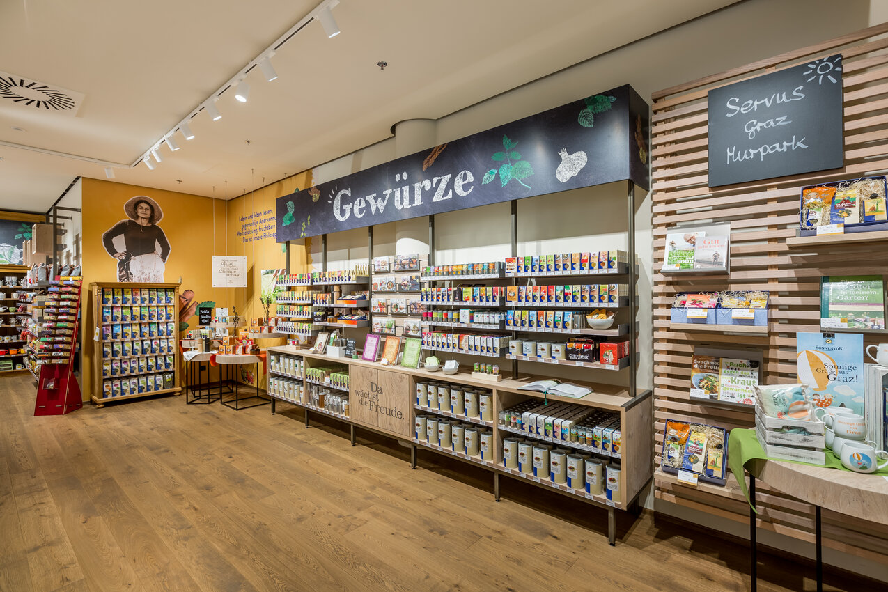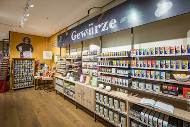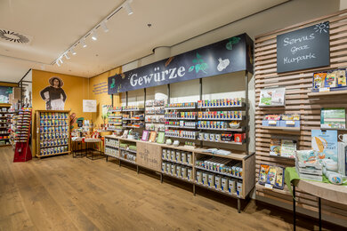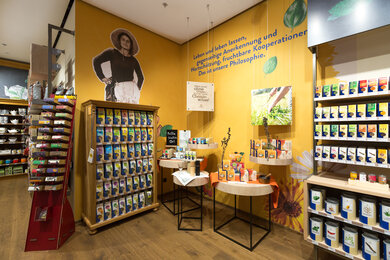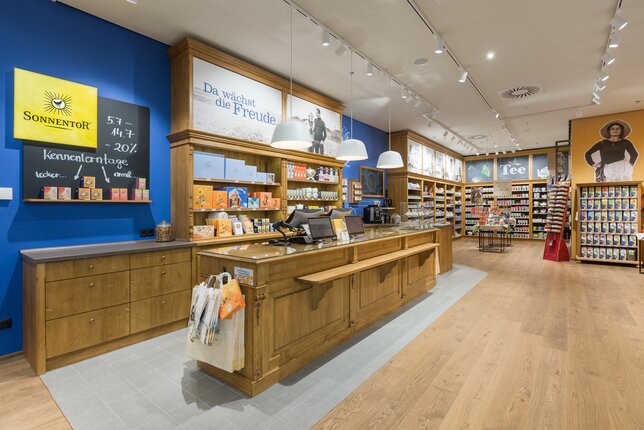 Wirf einen Blick in das SONNENTOR Geschäft - mit einem Klick ins Bild kannst du ganz einfach einen Rundgang machen: