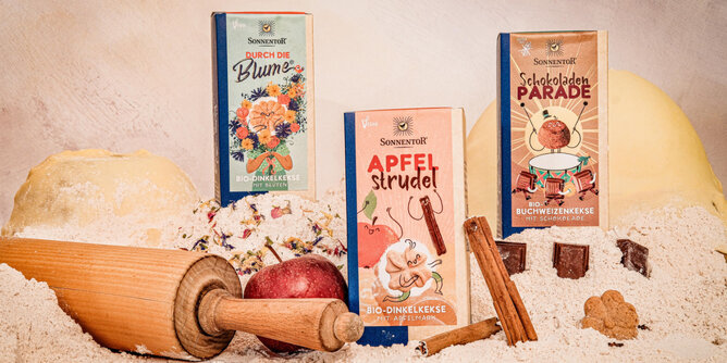 Die Durch die Blume-Kekse mit Blüten zum Beispiel halten länger als jeder Blumenstrauß – also, äh, rein theoretisch. Praktisch kann es natürlich passieren, dass sie in nullkommanix weggeknuspert werden. Aber dann kannst du immer noch auf die fruchtigen Apfelstrudel-Kekse ausweichen oder du lässt die Schokoladen Parade aufmarschieren. Diese Kekse sind dank Buchweizenmehl glutenfrei, aber alles andere als frei von Zartbitterschokolade – mampf! Alle Kekse werden übrigens ohne Palmöl gebacken.