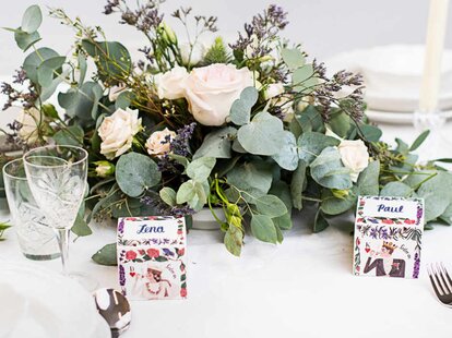 Weniger ist mehr und schlichte Deko liegt bei Hochzeiten im Trend. Deko-Elemente, Tischkärtchen und Menükarten kannst du aus natürlichen Materialien wie Holz, Stein, Blättern oder Muscheln basteln. Bienenwachskerzen sorgen für natürliches Licht und saisonale Wiesenblumen legen keine weiten Transportwege zurück. Die Blumensträuße können deine Gästen nach der Feier mit nach Hause nehmen.