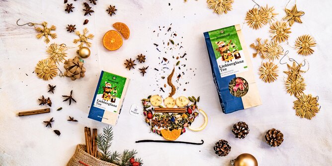 Mit dem Lichterglanz Tee bringt eine ganz neue Teesorte Glanz und Gloria in die Tasse. Die würzige Kräutermischung ist eine willkommene Abwechslung zu klassischen Früchtetees. Als loser Tee und im Doppelkammerbeutel erhältlich.