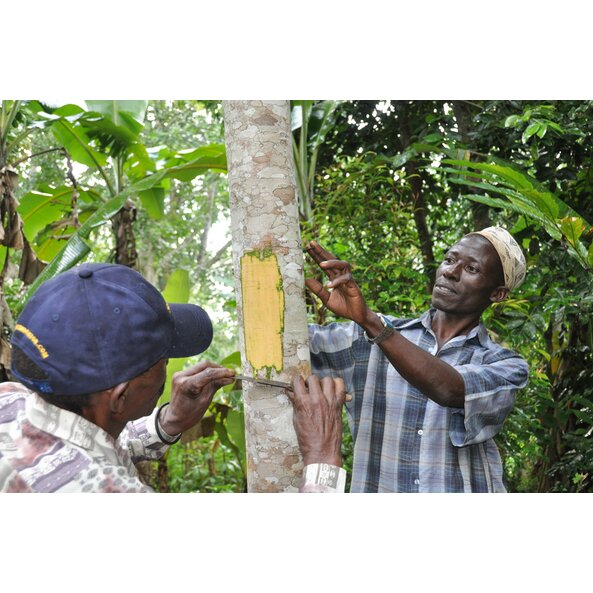 Auf dem Foto sind zwei Männer zu sehen die mit einem Messer Rinde vom Zimtbaum lösen.