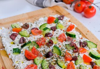 Fisch, Fleisch, Frischkäse, Gegrilltem, Käse, Meeresfrüchten, Salat, Tomaten, Vegetarische Gerichten