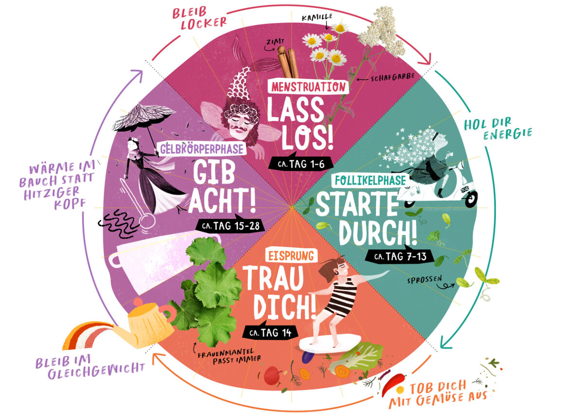 Hier verraten wir dir, wie du während des gesamten Zyklus auf deine Bedürfnisse achtest und deinen Rhythmus findest. Dann wirft dich auch nichts mehr so einfach etwas aus der Bahn - im Gegenteil: Das neue Taktgefühl lässt dich in jeder Phase andere Stärken entdecken. Solltest du besonders starke Symptome verspüren, sollest du diese jedenfalls ernst nehmen und mit Ärzt:innen oder Gesundheitsexpert:innen deines Vertrauen sprechen.