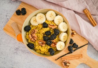 Du kannst deinen Körper während der Menstruation auch durch etwas angepasste Ernährung unterstützen: Salz und Zucker wandern in die letzte Reihe des Gewürzregals. Greif stattdessen z.B. zu unseren Adios Salz-Varianten und zuckerfreien Gewürzmischungen wie Sams Porridge Gewürz. Wer es gerne deftig mag, greift beim Würzen zu Kreuzkümmel. Seine leicht bittere und scharfe Note passt gut in orientalische Gerichte. Gleichzeitig sorgt das Gewürz für ein wohliges Bauchgefühl. Auch beim Koffein zahlt sich eine Reduktion aus. Es kann nämlich einerseits die Aufnahme gerade jetzt dringend benötigter Vitamine und Nährstoffe bremsen und die vorhin erwähnten Trampeltiere kommen …