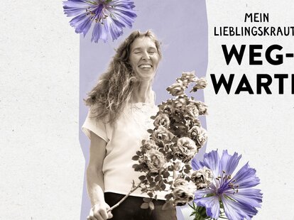 Das Bild zeigt Maria Schmidt zwischen Wegwarten und den Schriftzug "Mein Lieblingskraut: Wegwarte" | © SONNENTOR
