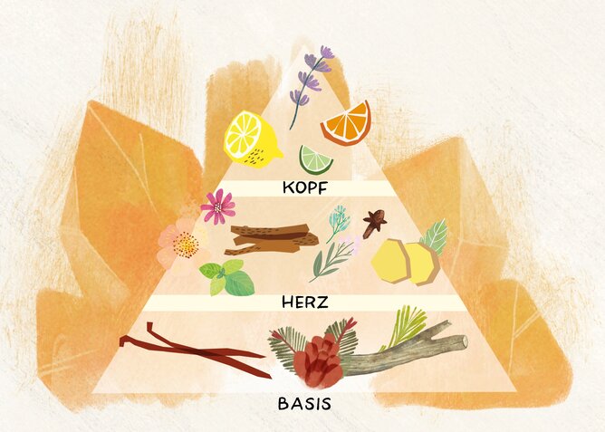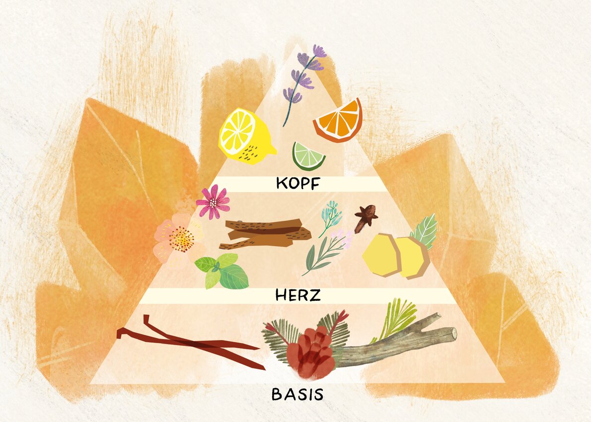 Beim Mischen von Düften ist es wichtig, Öle zu kombinieren, die unterschiedlich lange duften und sich gegenseitig heben. Eine ausgewogene Duftmischung kann man sich als Pyramide vorstellen. An der Spitze steht die flüchtige Kopfnote, die Mitte bildet die intensivere Herznote und die langanhaltende Basisnote ist das Fundament des Duftes.