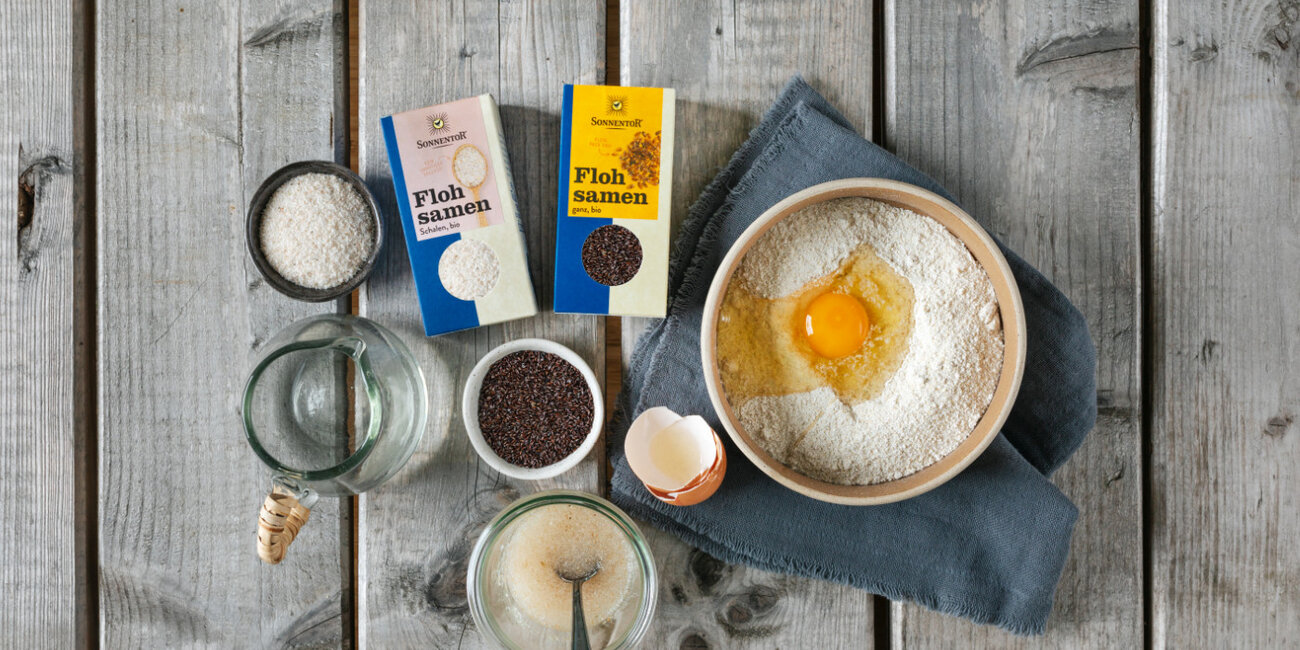 Flohsamenschalen sind ein wunderbarer Ei-Ersatz beim Backen. 1,5 Esslöffel Flohsamenschalen mit ca. 200 ml Wasser ersetzen etwa zwei Eier.