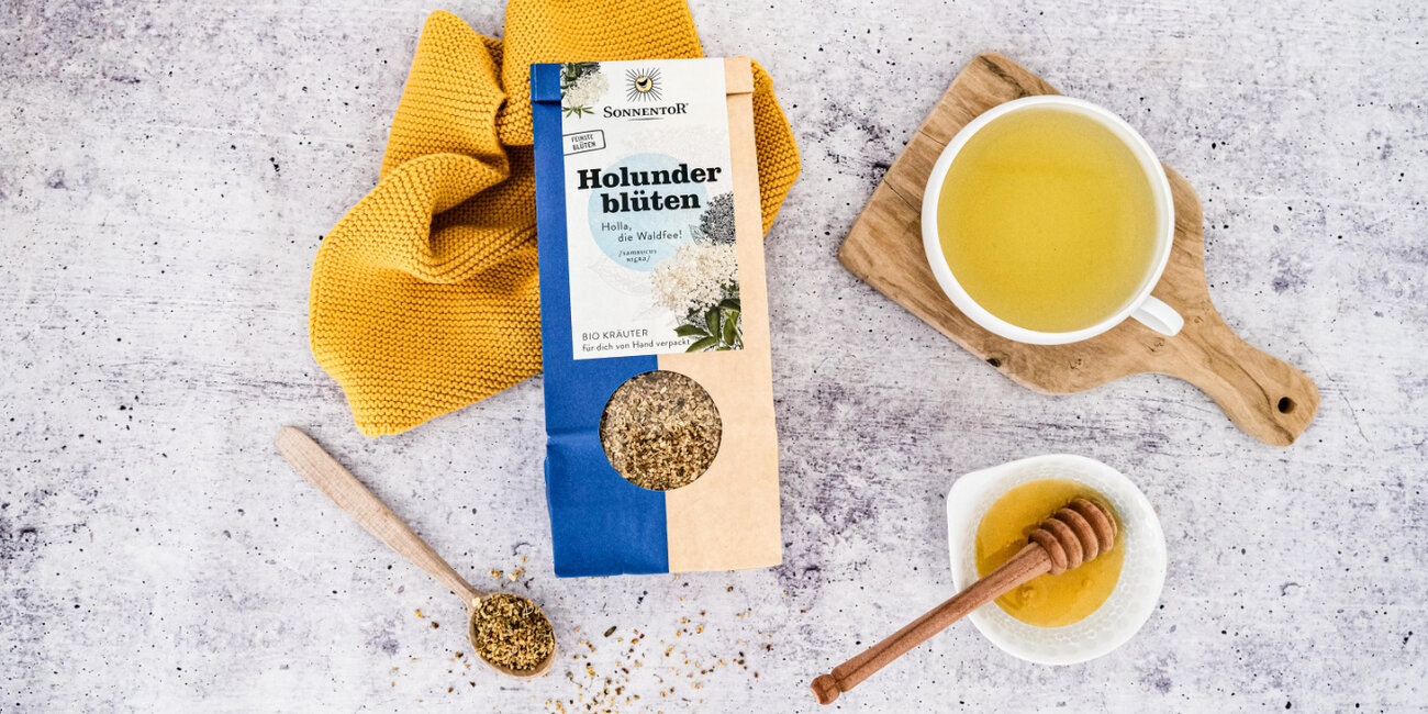 Holunderblüten ergeben einen köstlichen Tee mit blumig-süßlichem Geschmack, der erfrischt und gleichzeitig mit zarten Honignoten verwöhnt. Probier den Tee unbedingt als Getränkebegleitung zum Dessert!