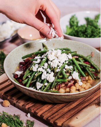 In der Zwischenzeit in einem Gefäß Wasser mit Gemüsebrühe vermischen und zu den grünen Bohnen kippen. 4–5 Minuten köcheln lassen, bis die Bohnen weich aber noch bissfest sind.
