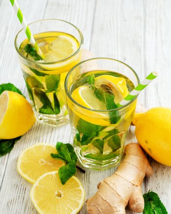 Beim Anrichten ein Glas zu 2/3 füllen, einen Schuss Ingwer-Zitronen Sirup dazugeben und mit kaltem Mineralwasser auffüllen.