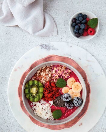 Mandeln klein hacken. Smoothie in Schüsseln geben und mit Chiasamen, Gojibeeren, Blüten und/oder Flower Power-Gewürz, Kiwi, Bananenscheiben, Minzblättern und gehackten Mandeln bestreut servieren.