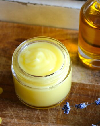 Abschließend gibt man 10 Tropfen ätherisches Lavendelöl dazu und füllt die Creme in Tiegel.