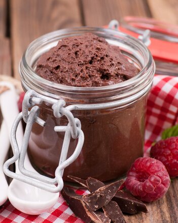 Schokolade über Wasserbad schmelzen. Seidentofu mixen und mit Agavendicksaft, Pulverkaffee und Aladins Kaffeegewürz vermengen.